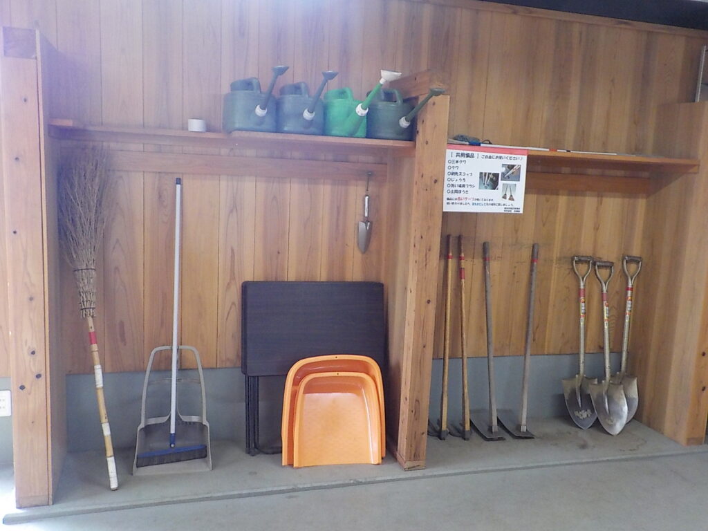 利用者倉庫内には、個人用収納スペースがあり、貸し出し用農具(クワ・スコップ・ジョウロ等)を常備しています。